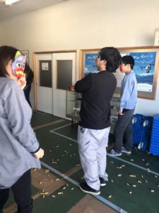 「おにはーそと」で、一斉に豆を投げました。