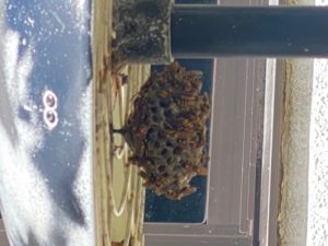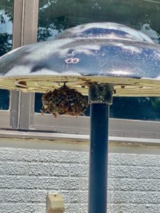 暑い夏です。 2020年 08月17日 長い長い梅雨が明けたとたん、今までにない暑さがやってきました。 静岡県では連日40度を超えてるとか! 皆様お気を付けください。 お盆休みが終わり、通常稼働1日目。 朝、社長から「ハチの巣があるので気を付けるように」と連絡がありました。 出社してみてみると…いつの間に!! 成虫がブンブンと羽を動かして巣にたくさんいました。不思議と怖いもの見たさで覗いてしまいます。 暑さの中、頑張って巣を作ったと思いますが、だれも刺されないうちに…駆除いたします。