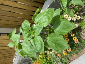 雨は植物にとって恵の雨です。 今年のヒマワリもぐんぐん大きくなってきました。